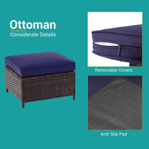 7-Pieces Patio Conversation Set with Side Table, Loveseat Sofa and Ottomans Brown Wicker with Navy Blue Cushions