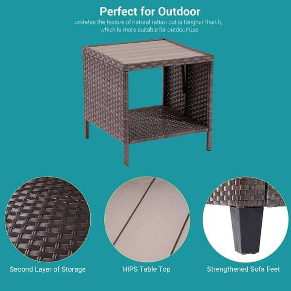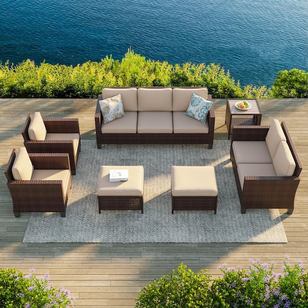 7-Pieces Patio Conversation Set with Side Table, Loveseat Sofa and Ottomans Brown Wicker with Sand Cushions