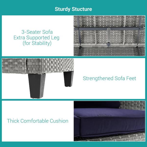7-Pieces Patio Conversation Set with Side Table, Loveseat Sofa and Ottomans Gray Wicker with Navy Blue Cushions