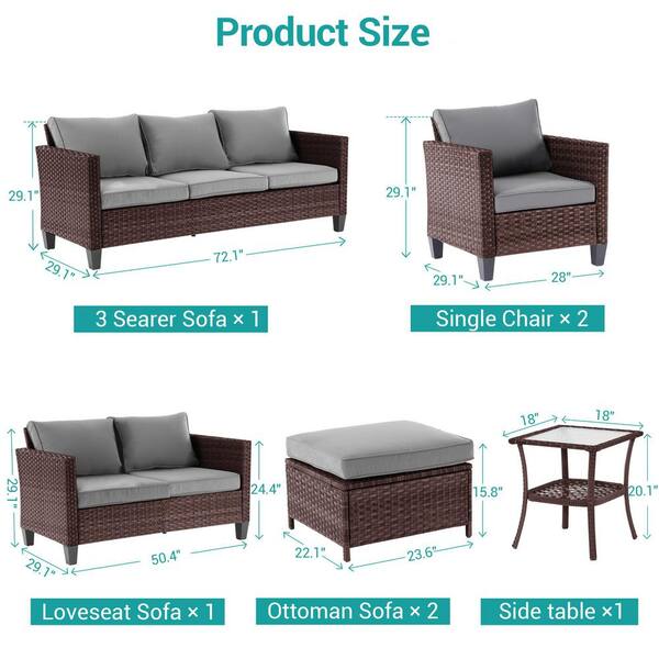 7-Pieces Patio Conversation Set with Side Table, Outdoor Armchair and Ottomans Brown Wicker with Gray Cushions