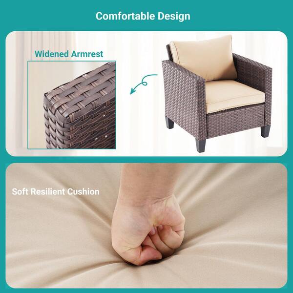 7-Pieces Patio Conversation Set with Side Table, Outdoor Armchair and Ottomans Brown Wicker with Sand Cushions