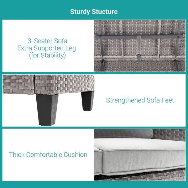 7-Pieces Patio Conversation Set with Side Table, Outdoor Armchair and Ottomans Gray Wicker with Linen Gray Cushions