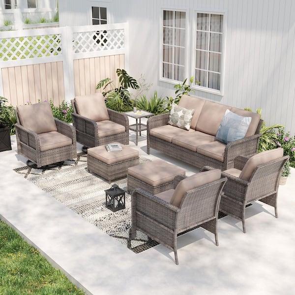 8-Piece Patio Conversation Sofa Set Gray Wicker with Swivel Rocking Chair and Side Table, Sand Cushion