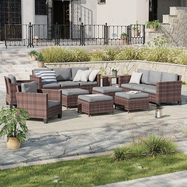 9-Piece Patio Sofa Set Brown Wicker Outdoor Furniture Set with Side Table, Gray