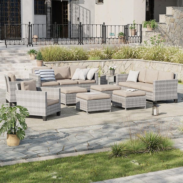 9-Piece Patio Sofa Set Gray Wicker Outdoor Furniture Set with Side Table, Linen Flax Beige