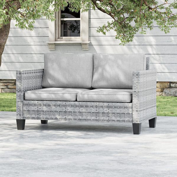 All-Weather Metal Frame Gray Wicker Outdoor Loveseat Patio Chaise Lounge with Linen Gray Cushions