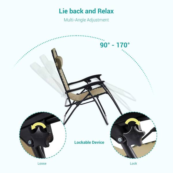 Folding Zero Gravity Metal Frame Recliner Outdoor Lounge Chair With Side Tray, Adjustable Headrest in Beige (2-pack)