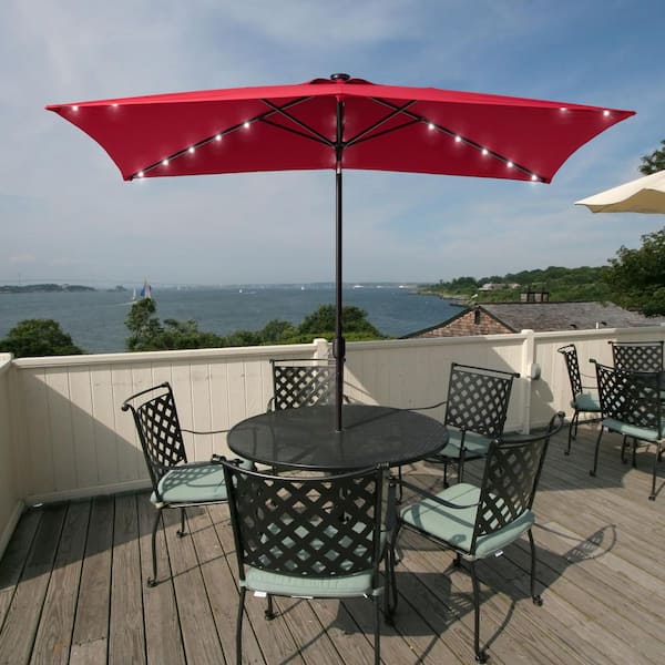 Solar LED 10 ft. x 6.5 ft. Aluminum Patio Rectangle Market Umbrella in Red with Push-Button Tilt