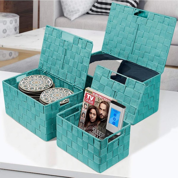 3 Sizes Storage Basket with Lid, Mesh Hand-Woven Organizers, Blue 13.5 in. x 6.9 in. Plastic Decorative Box Set of 3