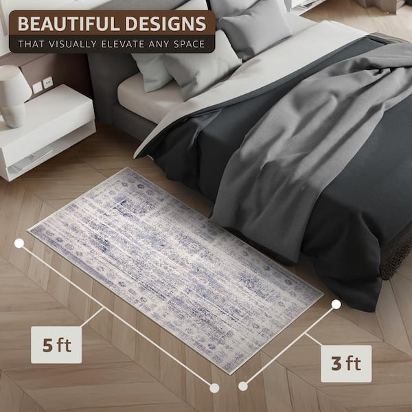 Blue 3 ft. x 5 ft. Border Area Rug for Entryway Machine Washable Non-Slip Vintage Rug-Low Pile Non-Shedding Indoor Rugs