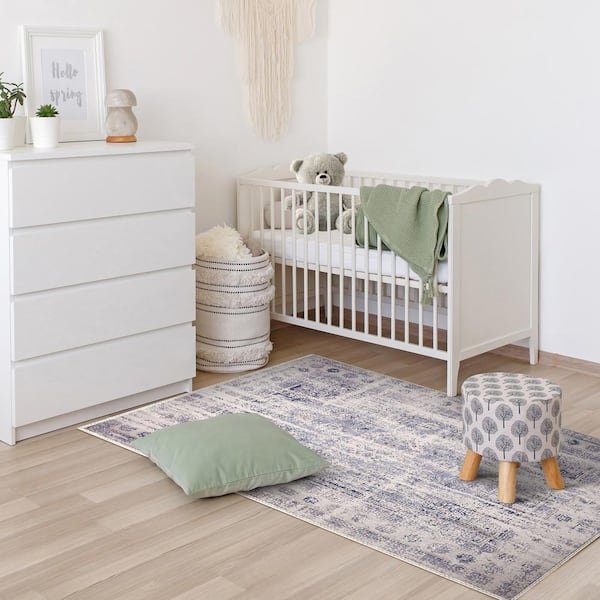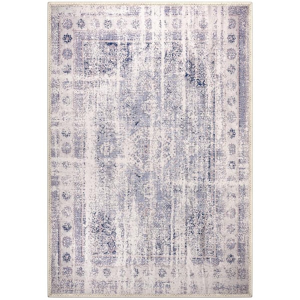 Blue 5 ft. x 7 ft. Border Area Rug Machine Washable Non-Slip Vintage Rug-Low Pile Non-Shedding Rugs with Rubber Backing