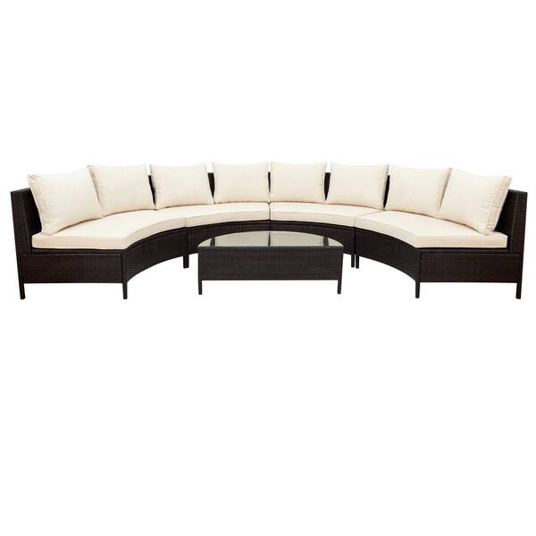 5-Piece PE Rattan Wicker Sofa Set-Outdoor Sectional Set with Tempered Glass Table with Cushions Beige