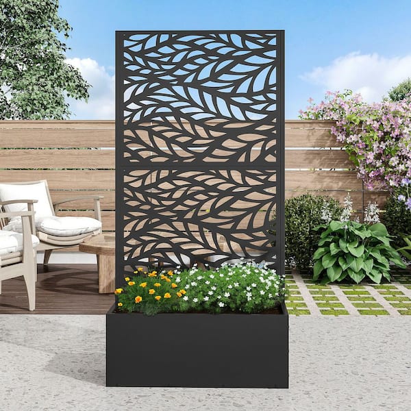 Black Metal Rectangles Outdoor Planters Raised Garden Bed with Hollow Pattern Screen-with Climbing Frame