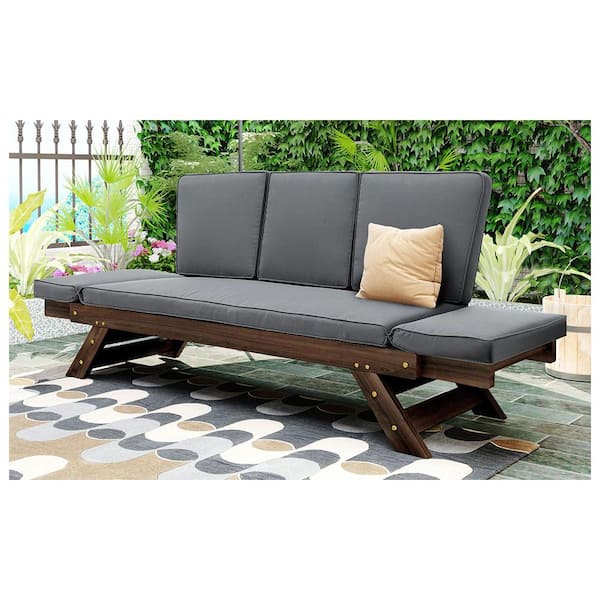 Outdoor Brown Wood Outdoor Patio Furniture Sectional with Cushions Gray Neutral Cushions