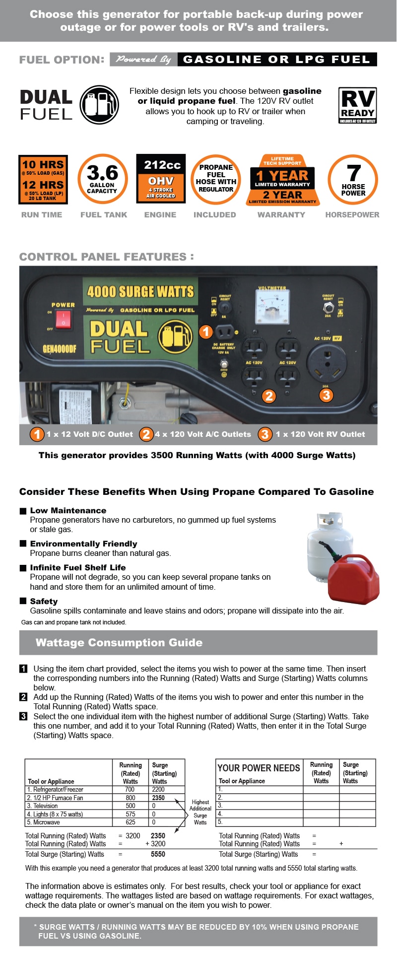 The Sportsman 4,000/3,250-Watt Propane Gas Powered Portable Generator offers power and convenience. A 4,000 peak-Watt output runs all RV household appliances and power tools with ease, making it ideal for camping, emergency power, or a job site. For charging power inside or outside, it features 4 120-Volt outlets, 1 120-Volt RV outlet and 1 12-Volt DC outlet. This generator runs with gasoline or liquid propane gas for added flexibility.