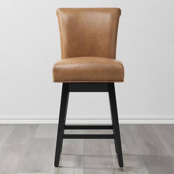 Dennis 26 in. Cognac Brown Solid Wood Frame Swivel Counter Height Bar Stool with Back and Faux Leather Seat