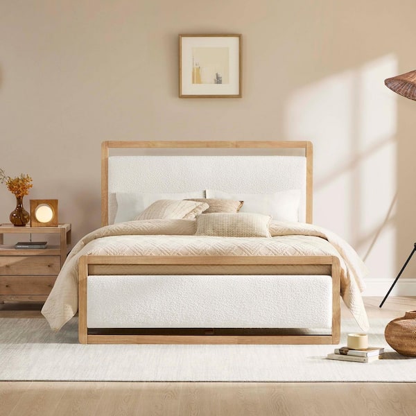 Liam White Wood Frame Queen Platform Bed Frame with USB Charging Port, Upholstered Headboard 16 Wooden Slats for Bedroom