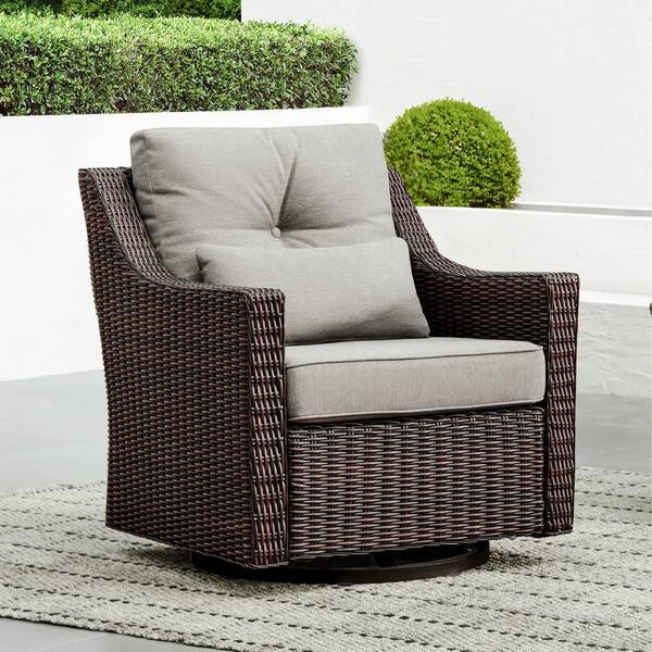 Thaddeus 3 Pieces Brown Fabric Rocking Wicker Swivel Arm Chairs and Side Table with Grey Cushions for Outdoor & Indoor