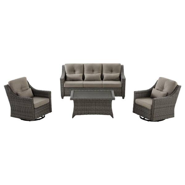 Thaddeus 4 Pieces Gray Fabric Wicker Living Room Set with 3-Seater Sofa, 2-Swivel Chairs and Coffee Table
