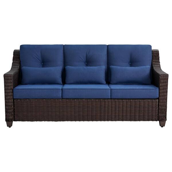 Thaddeus 74 in. Flared Arm Fabric Wicker Straight Oversized Rectangle 3-Seater Sofa Couch in Blue,Weather Resistant