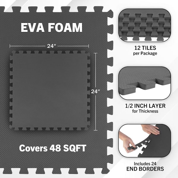 Interlocking Gray 24 in. W x 24 in. L x 0.5 in Thick Exercise/Gym Flooring Foam Tiles - 12 Tiles\Case (48 sq. ft.)