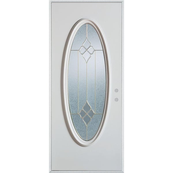 32 in. x 80 in. Geometric Brass Full Oval Lite Painted White Left-Hand Inswing Steel Prehung Front Door