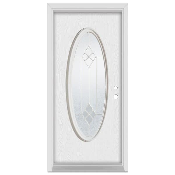 32 in. x 80 in. Geometric Left-Hand Full Oval Brass Finished Fiberglass Oak Woodgrain Prehung Front Door