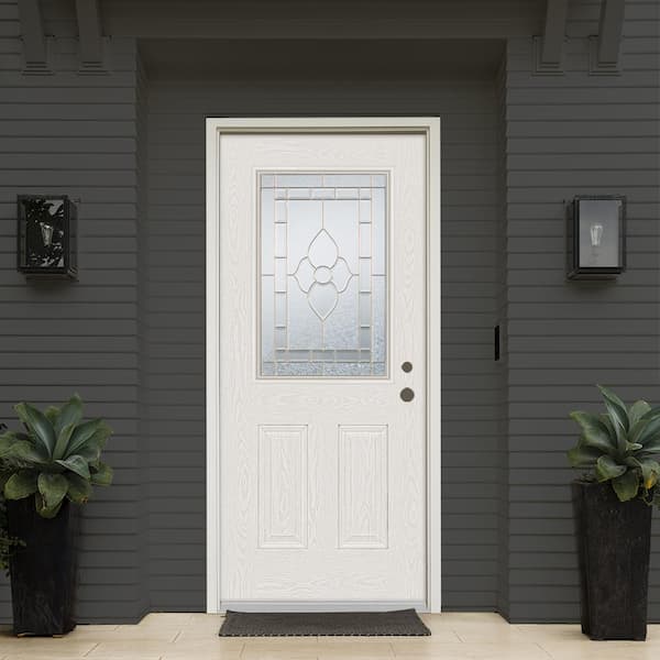 32 in. x 80 in. Traditional Left-Hand Brass Finished Fiberglass Oak Woodgrain Prehung Front Door
