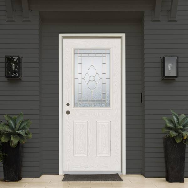 36 in. x 80 in. Traditional Right-Hand Brass Finished Fiberglass Oak Woodgrain Prehung Front Door
