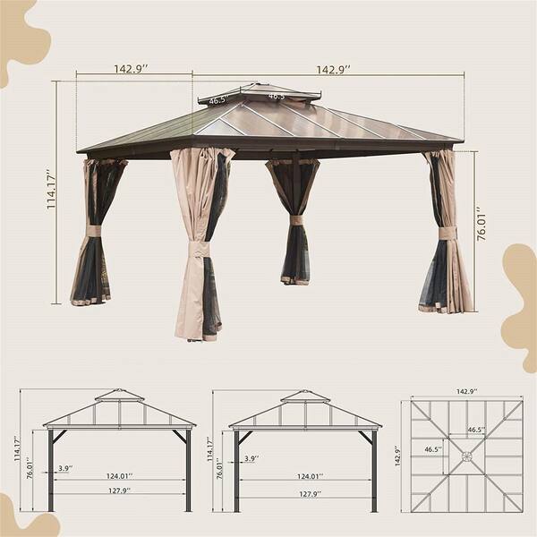 12 ft. x 12 ft. Brown Aluminum Outdoor Hardtop Patio Gazebo with Polycarbonate Double Poof with Netting and Curtains