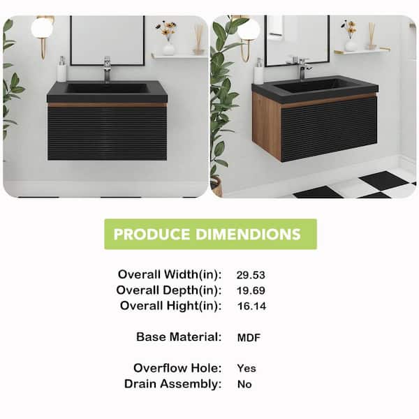 30 in. Single Sink Wall Mount in Nature Oak and Black Bath Vanity with Black Quartz Sand Top Assembled