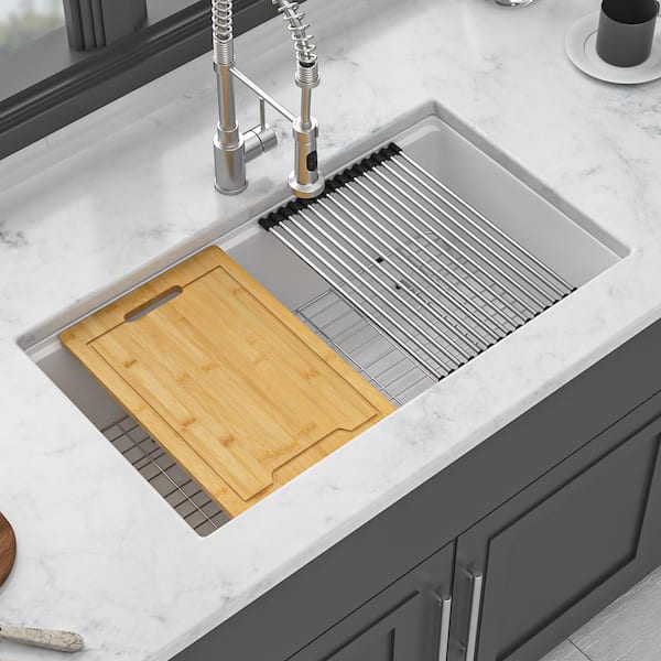 30 in. Undermount Single Bowl White Quartz Kitchen Sink with Bottom Grids