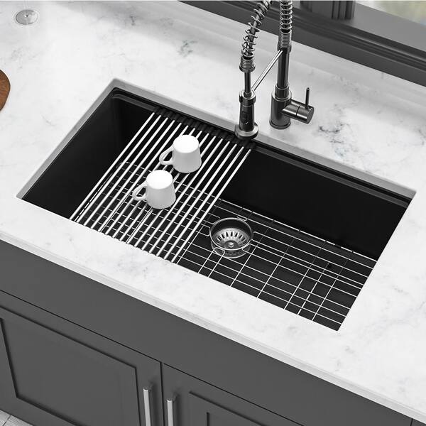 32 in. Undermount Single Bowl Black Quartz Kitchen Sink with Bottom Grids