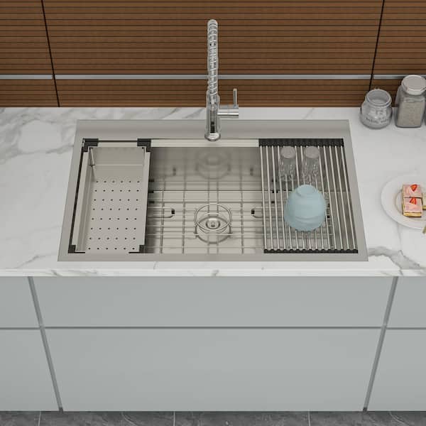 33 in. Drop in. Single Bowl 18 Gauge Brushed Nickel Stainless Steel Kitchen Sink with Workstation