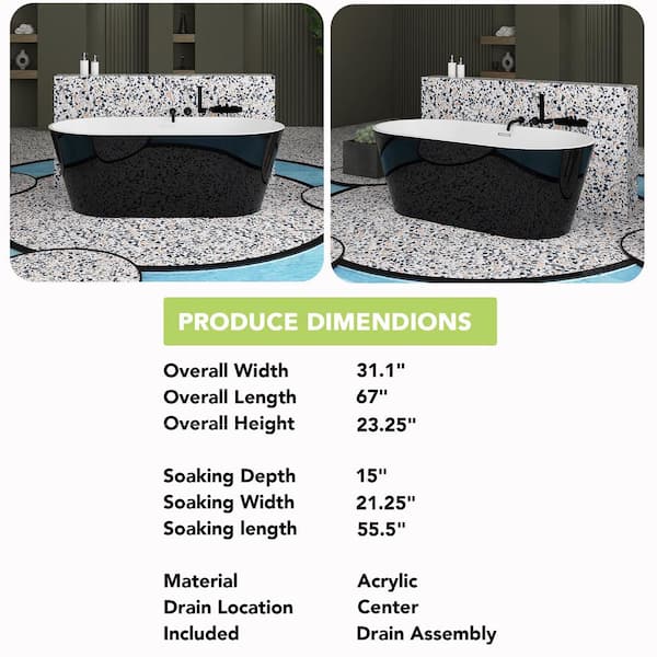 67 in. x 31.1 in. Acrylic Freestanding Soaking Bathtub with Center Drain in Glossy Black/Polished Chrome
