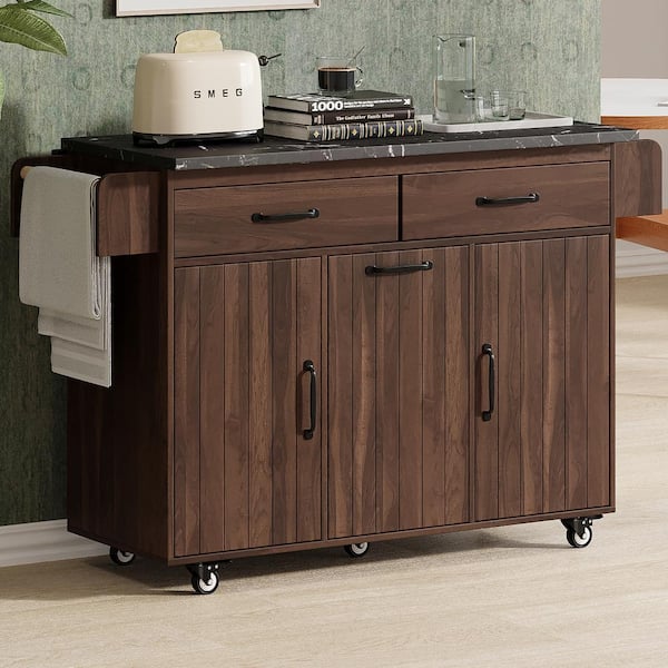 Walnut Brown Particle Board Kitchen Cart with 2 Door Cabinet, Spice Rack, Drop Leaf and Towel Rack