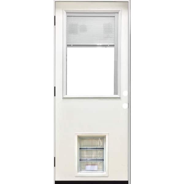 32 in. x 80 in. Reliant Series Clear Mini-Blind RHOS White Primed Fiberglass Prehung Front Door with Large Pet Door
