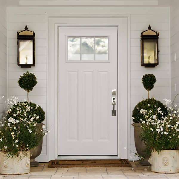 36 in. x 80 in. Reliant Series Craftsman Left-Hand Inswing 3-Lite Clear White Primed Fiberglass Prehung Front Door