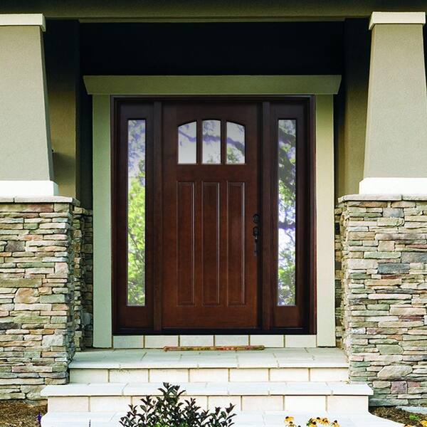 64 in. x 80 in. Craftsman 3 Lite Arch Stained Mahogany Wood Prehung Front Door with Sidelites