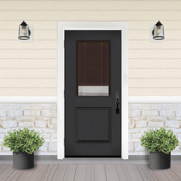 Legacy 30 in. x 80 in. 1/2 Lite Clear Glass Mocha Miniblind RHOS Black Finish Fiberglass Prehung Door w/6-9/16 in. Jamb