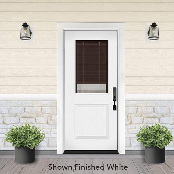 Legacy 30 in. x 80 in. Universal Handing 1/2-Lite Clear Glass Mocha Miniblind White Finish Fiberglass Front Door Slab