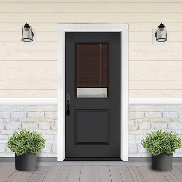 Legacy 36 in. x 80 in. 1/2-Lite Clear Glass Mocha Miniblind RHIS Black Finish Fiberglass Prehung Door w/4-9/16 in. Jamb