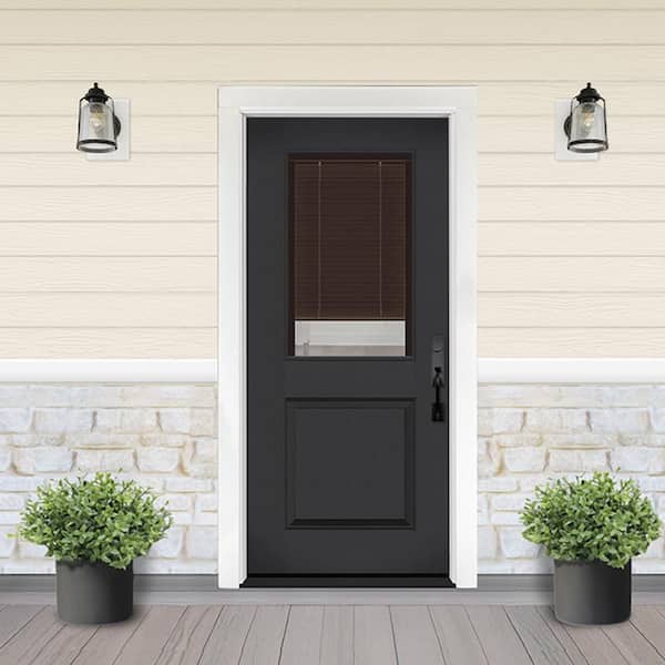 Legacy 36 in. x 80 in. Universal Handing 1/2-Lite Clear Glass Mocha Miniblind Black Finish Fiberglass Front Door Slab