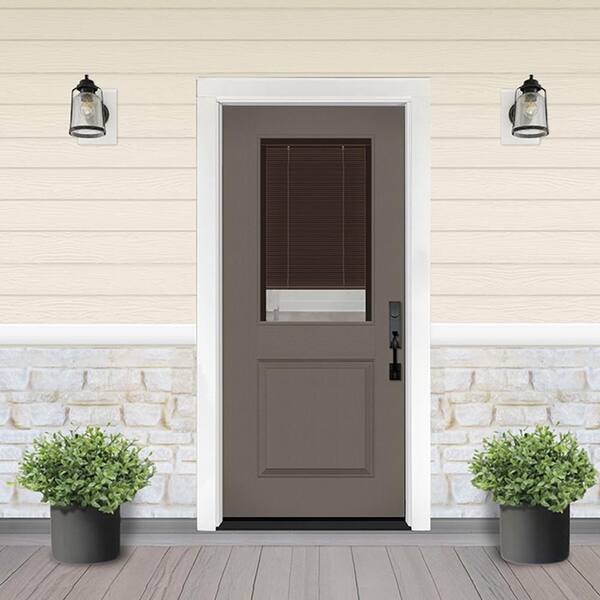 Legacy 36 in. x 80 in. Universal Handing 1/2-Lite Clear Glass Mocha Miniblind Kindling Finish Fiberglass Front Door Slab