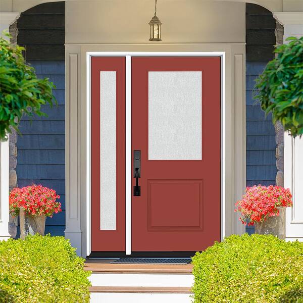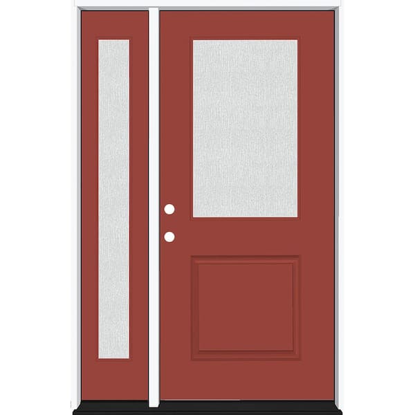 Legacy 53 in. x 80 in. 1/2 Lite Rain Glass RHIS Primed Morocco Red Finish Fiberglass Prehung Front Door w/14 in. SL