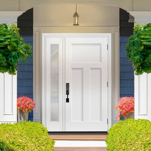 Legacy 53 in. x 80 in. 3 Panel Craftsman LHOS Unfinished White Fiberglass Prehung Front Door w/Clear 14" SL 4-9/16Jamb
