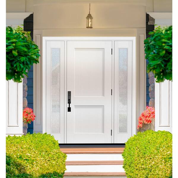 Legacy 64 in. x 80 in. 2P Squaretop Shaker LHOS Unfinished White Fiberglass Prehung Front Door wRain12in.SLs 4-9/16 Jamb