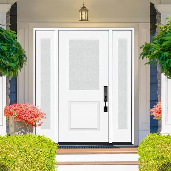 Legacy 68 in. x 80 in. 1/2 Lite Rain Glass LHIS White Primed Fiberglass Prehung Front Door w/Dbl 14 in. SL