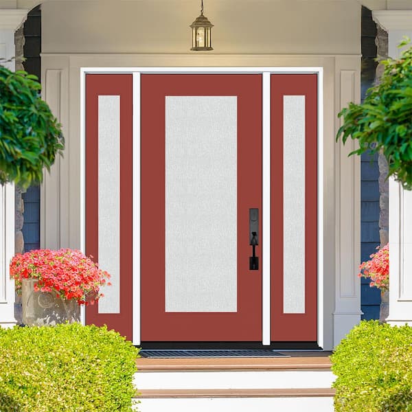 Legacy 68 in. x 80 in. Full Lite Rain Glass LHIS Primed Morocco Red Finish Fiberglass Prehung Front Door w/Dbl 14 in. SL