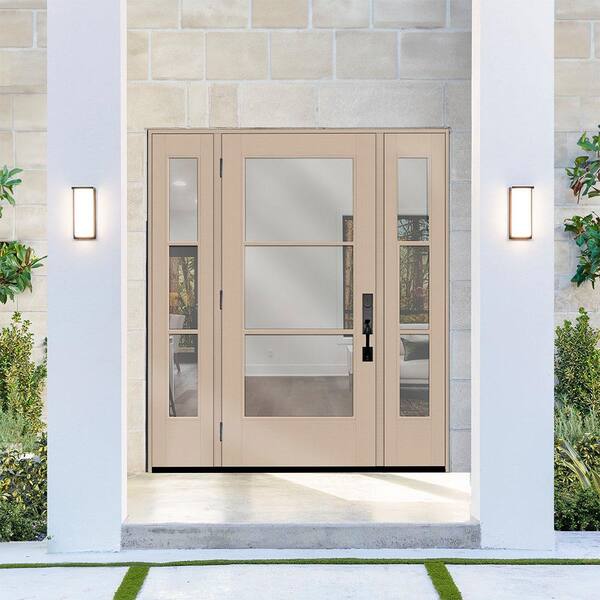 Legacy 68 in. x 80 in. Icon 3-Lite Modern ClearGlass RHOS Sandstn Mahogany Fiberglass Prehung Front Door Dbl 14 in. SL